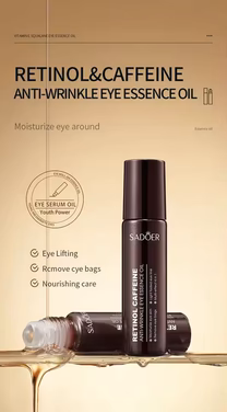Sadoer Retinol & Caffeine Anti Wrinkle Eye Essence Oil Roll-On combines two potent actives to target fine lines and fatigue around delicate eye contours. Retinol stimulates collagen production and cell renewal, while caffeine reduces puffiness and dark circles with its vasoconstrictive properties. The convenient roll-on applicator ensures precise, mess-free application with a cooling massage effect that enhances circulation. Ideal for those seeking professional-grade anti-aging results in a lightweight, easily absorbed formula designed specifically for the sensitive eye area